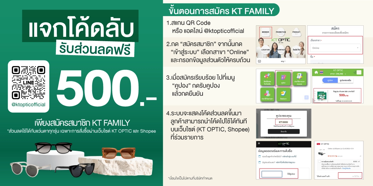 ร้านแว่นตา KT OPTIC Contact US ร้านแว่นตา KT OPTIC , D-Plus CO.,Ltd 1563 Soi Ladprow 94 (Panjamit) Plubpha Wangthonglang Bangkok 10310 TEL : 02-530-4155,02-934-4390 Line OA : @ktopticofficial