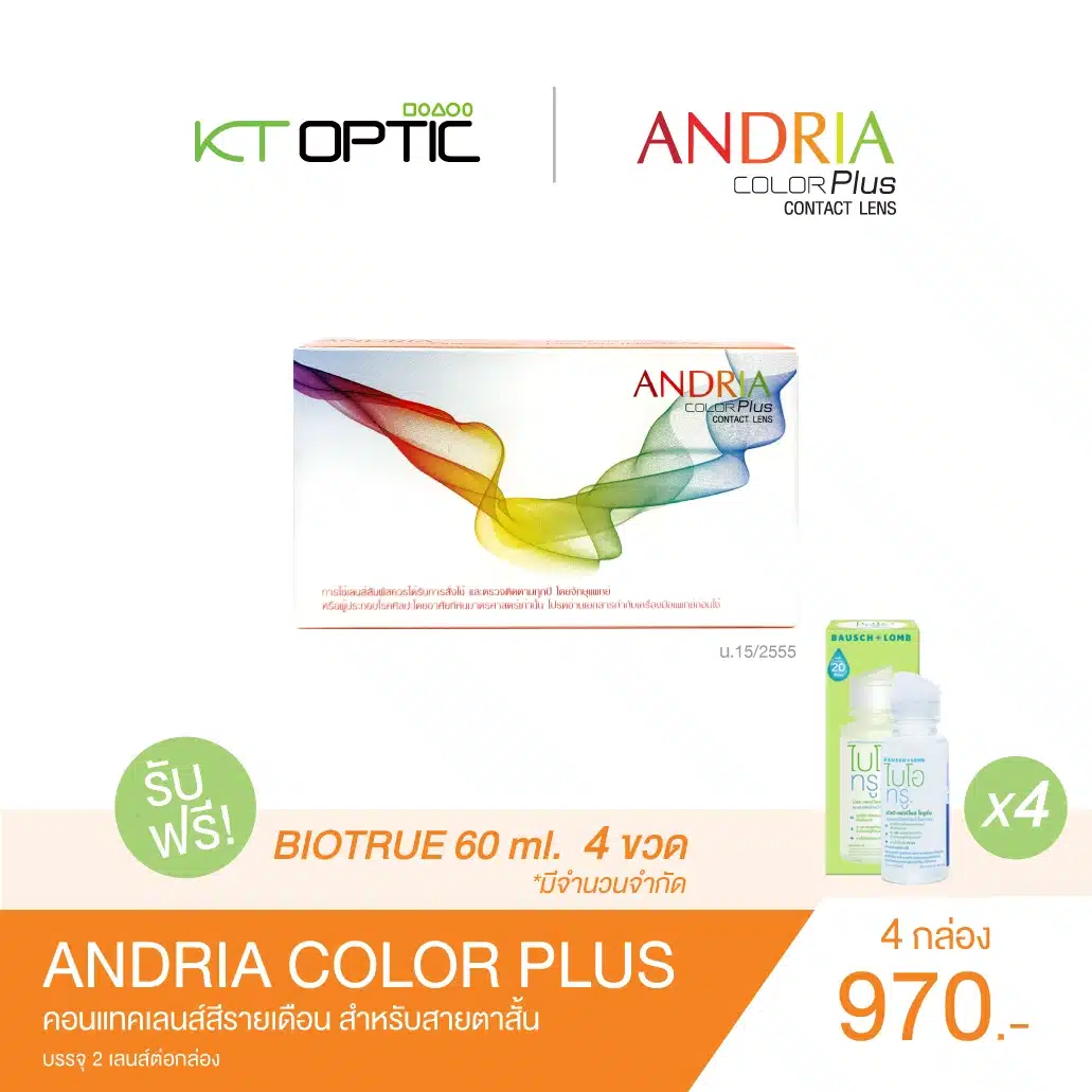 ANDRIA COLOR PLUS SET 2 BOX คอนแทคเลนส์สีรายเดือน สำหรับสายตาสั้น(ฟรี! Biotrue 60 ml. จำนวน 2 ขวด)