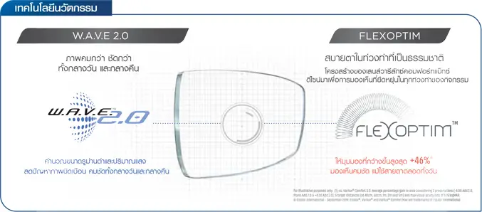 เทคโนโลยีเลนส์แว่นตา W.A.V.E. 2.0 คำนวนขนาดรูม่านตาและปริมาณแสง เพื่อลดปัญหาภาพบิดเบือน ทำให้มองเห็นคมชัดทั้งกลางวันและกลางคืน