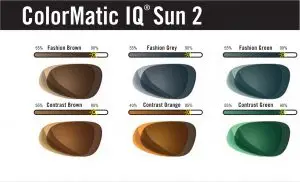 ColorMatic IQ SUN 2 ปกป้องดวงตาคุณจากแสงแดดด้วยแว่นกันแดดนำสมัย โดยมีความเข้มเริ่มต้นที่ประมาณ 40-55% และจะปรับเปลี่ยนความเข้มสีตามระดับของแสง UV มีกลุ่มสี Fashion ที่เหมาะกับแว่นแฟชั่นนำสมัย และ กลุ่มสี Contrast ที่เหมาะกับ กิจกรรมกลางแจ้งหรือการเล่นกีฬาที่เน้นเรื่องความคมชัด