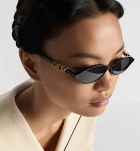 แว่นกันแดด DiorTreasure R1F โดดเด่นด้วยรูปทรงวงรีเรียวทันสมัย พร้อมกรอบอะซิเตทสีดำอันเป็นเอกลักษณ์ และโลโก้ Dior ชุบทองประดับด้วยคริสตัล Swarovski® สีขาว เลนส์สีเทาเข้มช่วยเสริมเสน่ห์อันน่าดึงดูดใจของแว่นกันแดด และดีไซน์ที่เรียบหรูช่วยเพิ่มความสง่างามให้กับทุกสไตล์